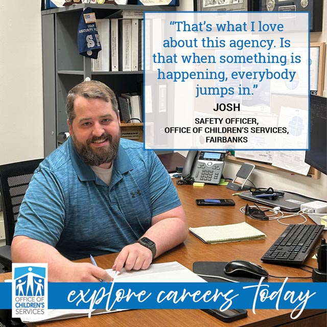 We are always looking for talented people to join our team! Positions within the Department of Family and Community Services range from administrative to in-person work with some of Alaska’s most vulnerable residents. Have a knack with people? Check out the open positions within our four Divisions: The Division of Juvenile Justice, the Alaska Psychiatric Institute, the Office of Children’s Services, and the Alaska Pioneer Homes.